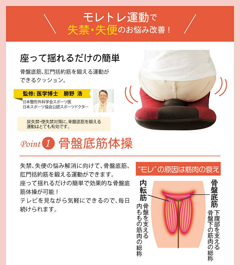 商品情報 品名 骨盤底筋 モレトレ美クス色 レッド×ブラウン材質 構造部材:金属(鋼) 張地:ポリエステルクッション材:ウレタンフォーム、発泡ポリエチレン生産国 中国製(企画デザイン:日本)本体重量(約) 1.5 kg耐荷重 100kgメーカー 株式会社メイダイ商品説明 ■医学博士勝野浩先生監修の骨盤底筋を鍛えるクッション ■尿失禁、便失禁のお悩み対策に■座って揺れるだけの簡単で効果的な骨盤底筋体操■漏れにくい体作り■ながら運動、無理なく続けられる■失禁、失便の悩み解消に向けて、骨盤底筋、肛門括約筋を鍛える 運動ができるクッション■底は船底型の不安定な形状で、座ると自然に骨盤底筋が意識され力が入ります■中央の突起にお尻を乗せて座る事で、肛門括約筋が意識されて、引き締めます■筋力がつく事で、モレの不安や悩みから解消され、夜間や外出時も安心■腹筋、背筋などの体幹部分の筋肉も同時に鍛えられます■お部屋でできる簡単運動レシピ付き■テレビを見ながら気軽にできるので、毎日続けられます骨盤底筋 モレトレ美クス 医学博士勝野浩先生監修の骨盤底筋を鍛えるクッション ■尿失禁、便失禁のお悩み対策に!■座って揺れるだけの簡単で効果的な骨盤底筋体操。