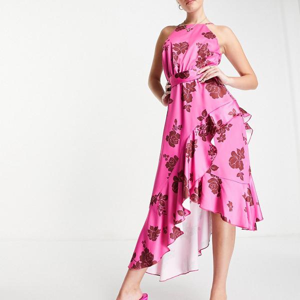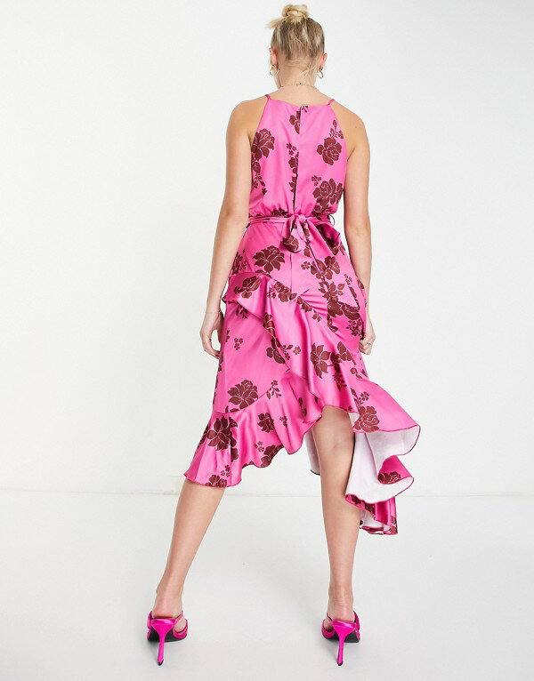スタイルチート Style Cheat 鮮やかなピンクの花柄のスタイルチートフリルラップネクタイミディドレス ワンピース レディース 女性 インポートブランド 小さいサイズから大きいサイズまで
