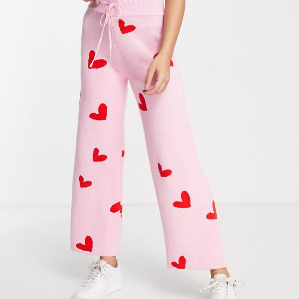 スタイルチート Style Cheat ピンクのハートプリントでコーディネートされたスタイルチートニットワイドレッグジョガー ボトム パンツ レディース 女性 インポートブランド 小さいサイズから大きいサイズまで