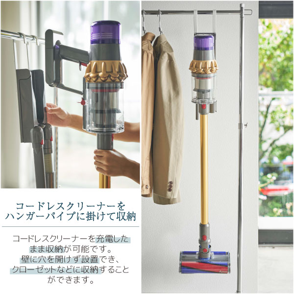 クリーナーハンガーを使用することで、ダイソン コードレスクリーナーをハンガーパイプに掛けて収納できるようになります。